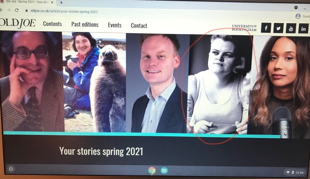 Image: Author’s own, taken of the University of Birmingham’s alumni website, http://www.oldjoe.co.uk. The general website content/layout contained within the image above itself is therefore the University of Birmingham’s property (to the best of my knowledge), bar the author image. The image of the author contained within the above image is the work of Simon Holliday who is credited accordingly within the online article itself. 2021