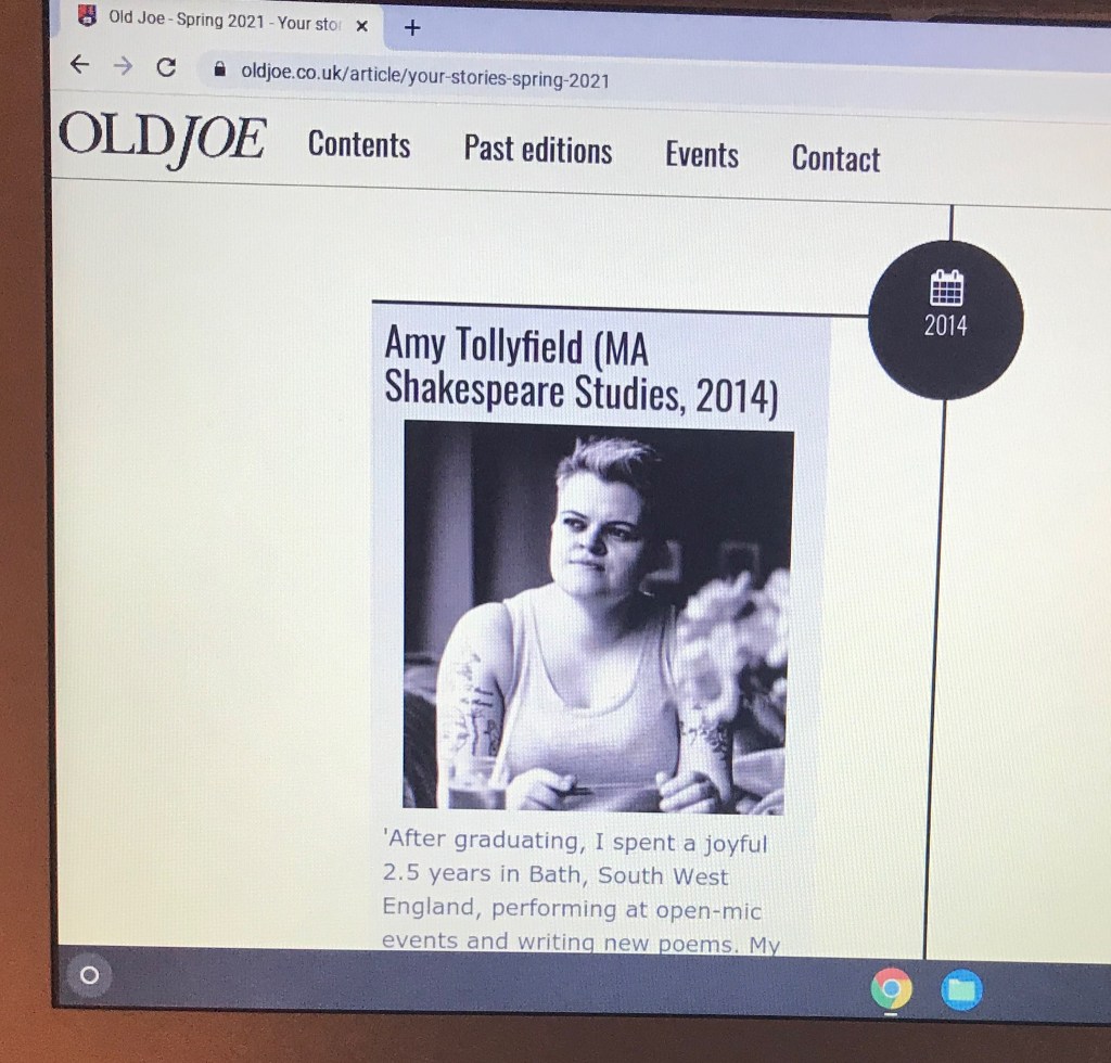 Image: Author’s own, taken of the University of Birmingham’s alumni website, http://www.oldjoe.co.uk. The general website content/layout contained within the image above itself is therefore the University of Birmingham’s property (to the best of my knowledge), bar the information about the author (Amy Tollyfield), which was provided by the author herself, and the author image. The image of the author contained within the above image is the work of Simon Holliday who is credited accordingly within the online article itself. 2021