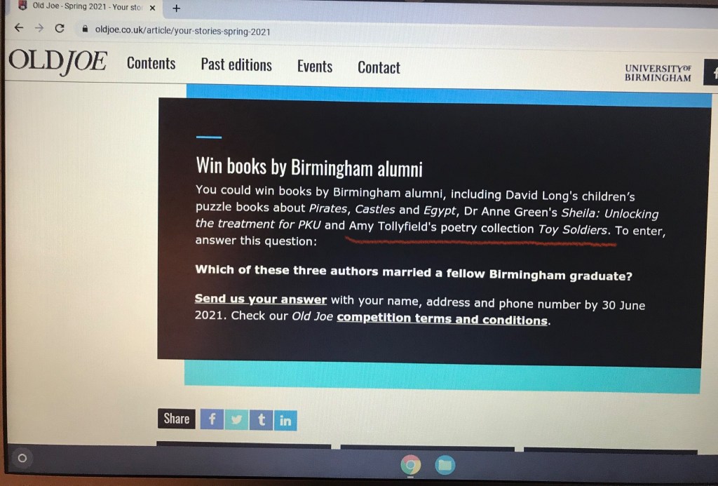 Featuring in the University of Birmingham’s online alumni magazine, Old Joe. Spring 2021 issue, released online 20th May 2021. Link to article featuring Amy and her books: https://www.oldjoe.co.uk/article/your-stories-spring-2021