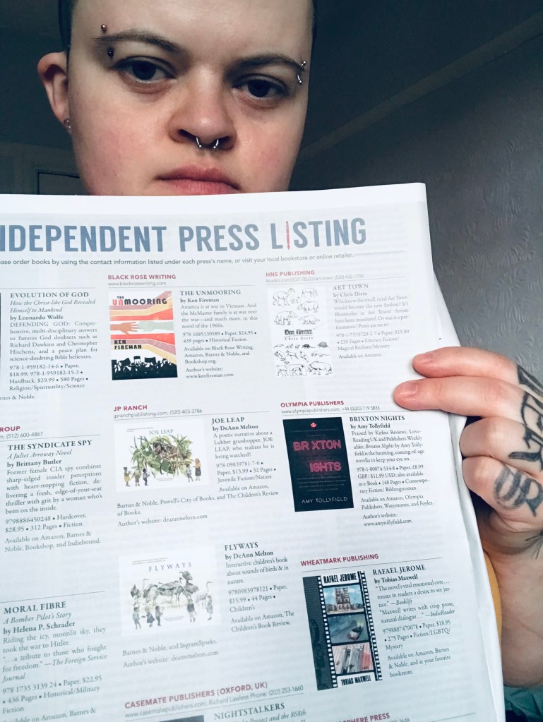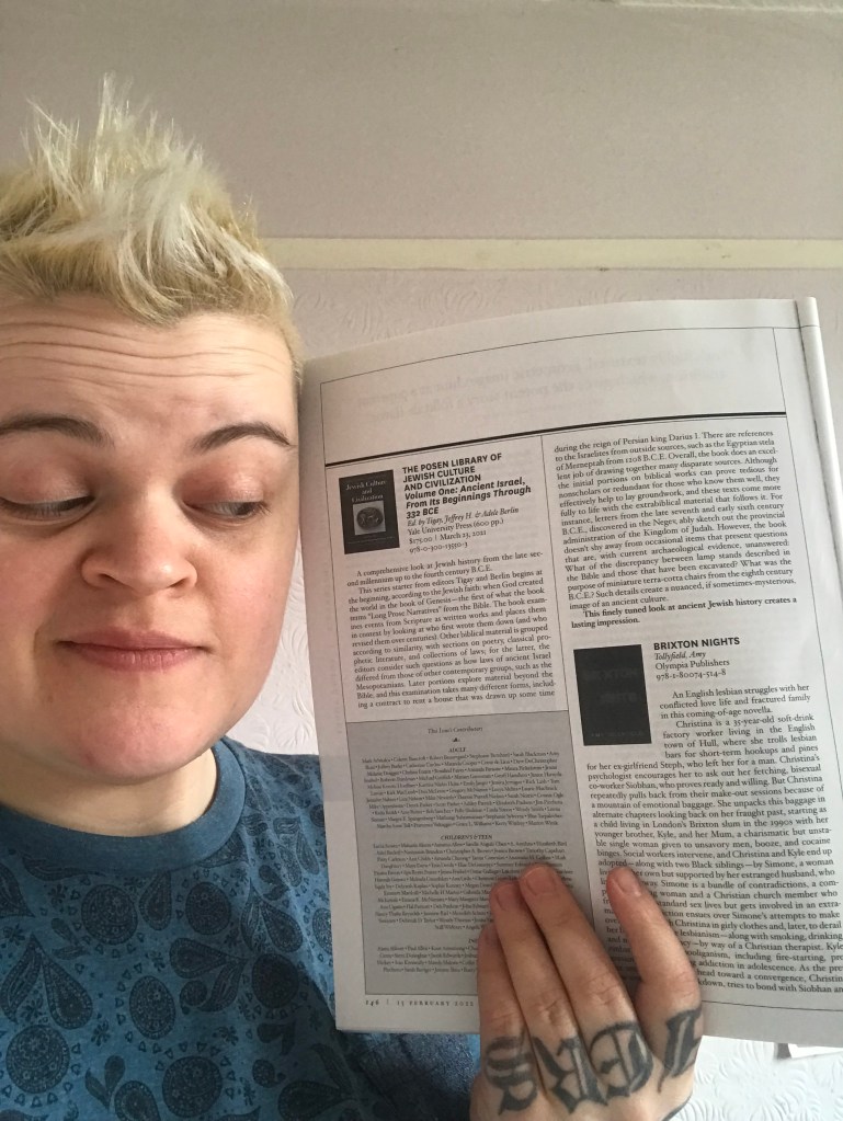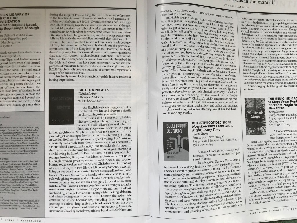 Featuring in the February 2022 issue of highly regarded Kirkus Reviews magazine: an opportunity afforded to less than 10% of indie authors! Photo: Author’s own, 2022. Photo shows the inside of the magazine (specifically, the pages that Kirkus Reviews‘ pre-publication review of Brixton Nights by Amy Tollyfield features on)