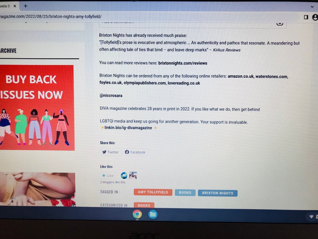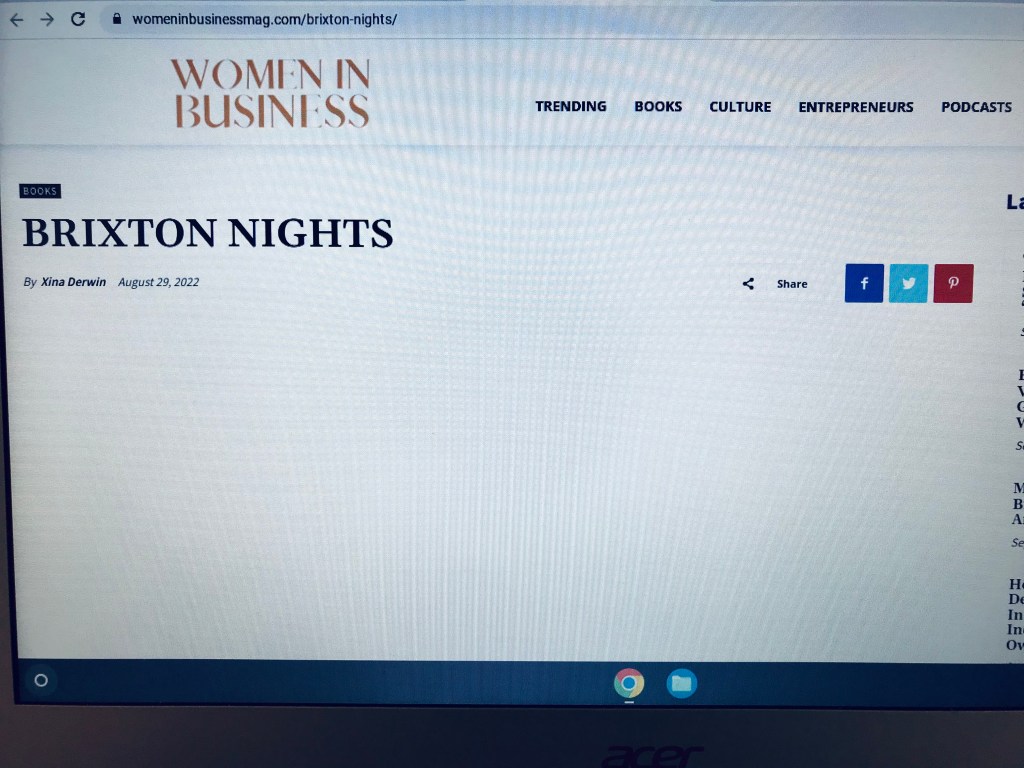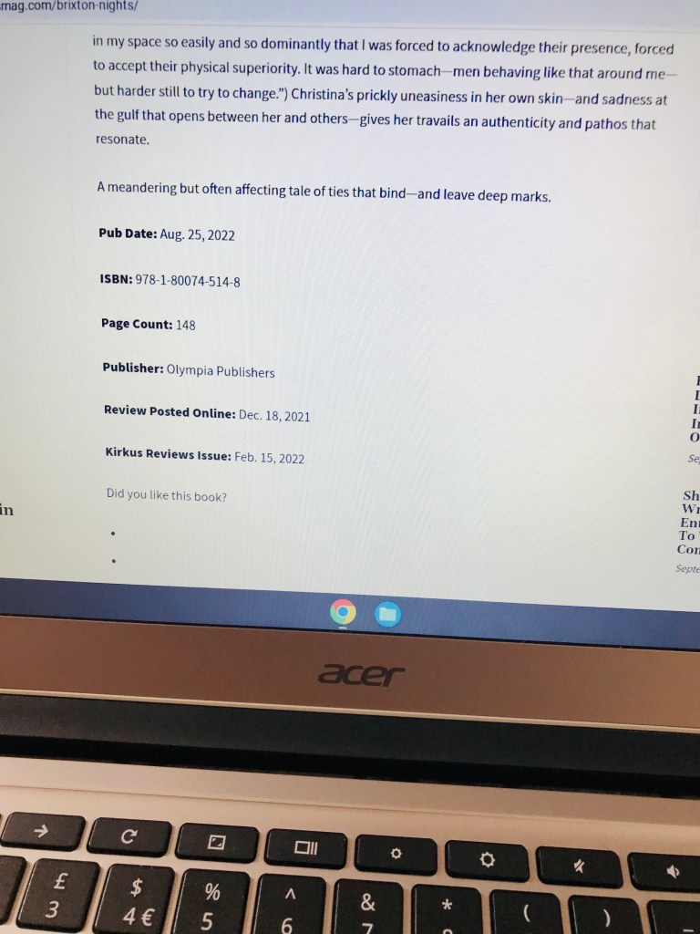 Image: Author’s own, of a website page on https://booklife.com. ‘BookLife’ and the ‘booklife.com’ domain are owned by Publishers Weekly. The image above displays Publishers Weekly‘s review of Brixton Nights by Amy Tollyfield, as featured on Publishers Weekly‘s ‘BookLife’ website. Image above photographed on Friday 7th October 2022