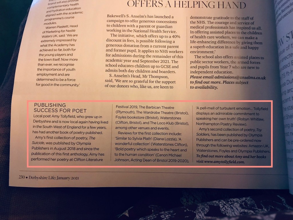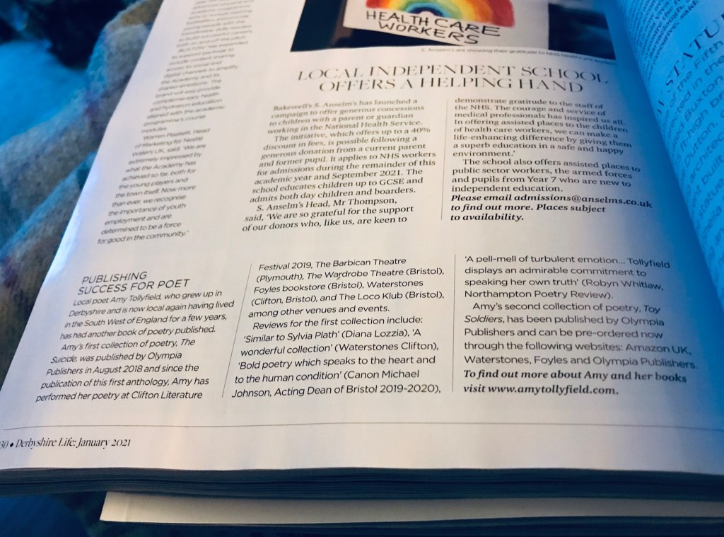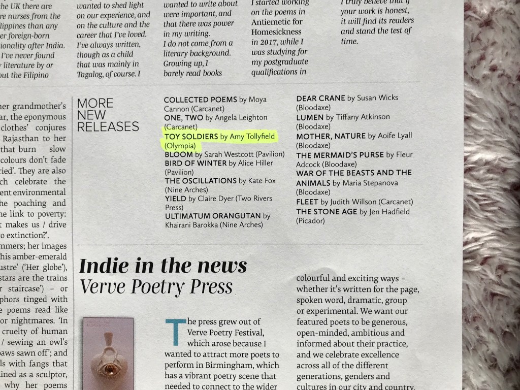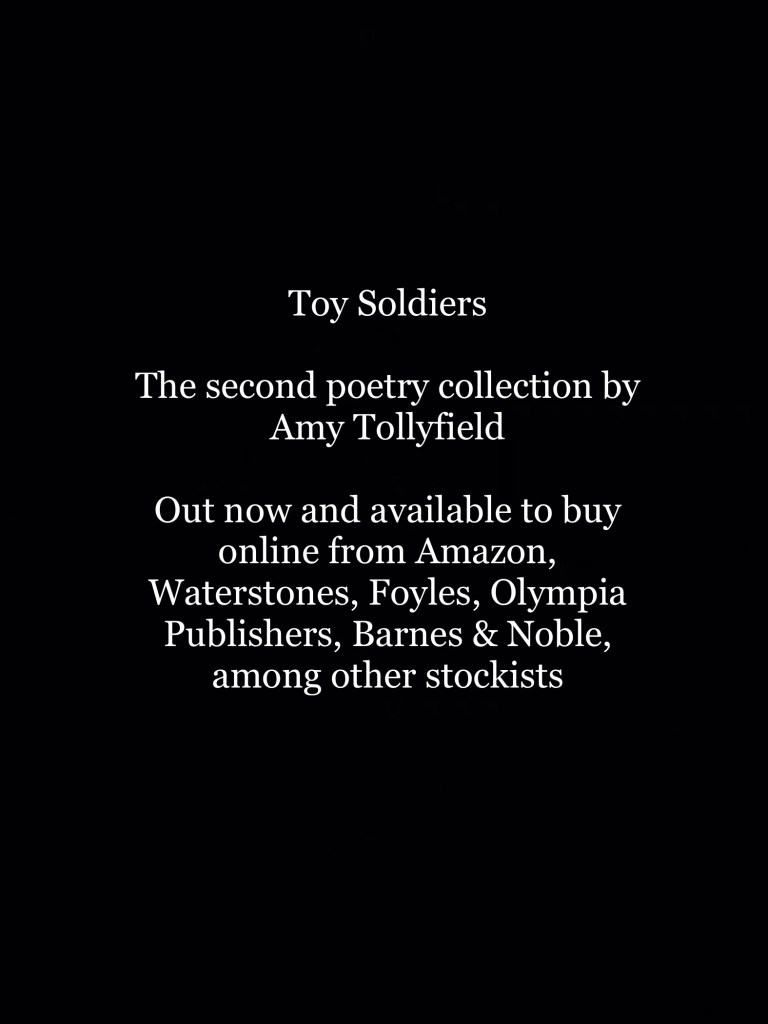 Scroll to the bottom of this page to see four photos I took during the build-up to the release of my second collection of poetry, Toy Soldiers, which will be available to buy later this year (now available to buy; visit the ‘Books’ tab on this website to find out more and to make your purchase: http://www.amytollyfield.com/books)